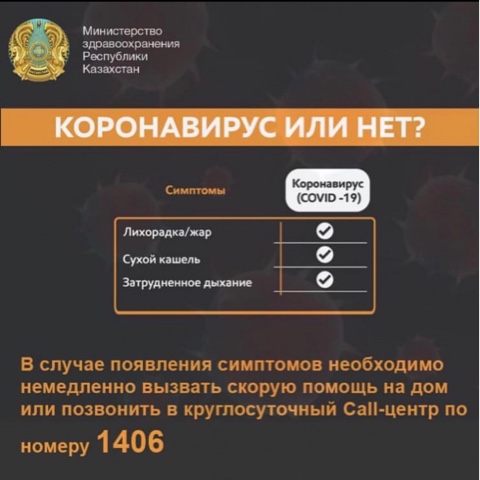 При появлении симптомов острой респираторной инфекции или подозрении на новую коронавирусную пневмонию необходимо вызвать скорую помощь на дом (103) или вызвать врача на дома, а также позвонить в call – центр по вопросам коронавирусной инфекции 109 или 1406, либо мобильное приложение iKOMEK 109 В случае тяжелой формы до приезда бригады скорой помощи соблюдать меры профилактики (ограничить контакт с людьми, соблюдение этикета кашля, ношения маски, не заниматься самолечением).